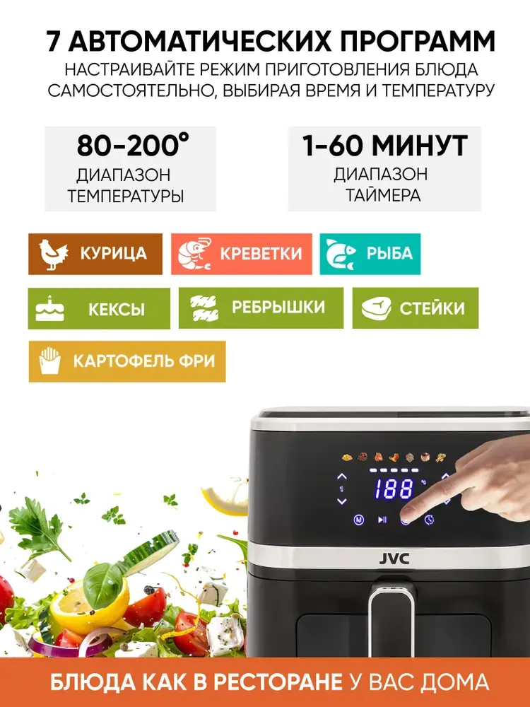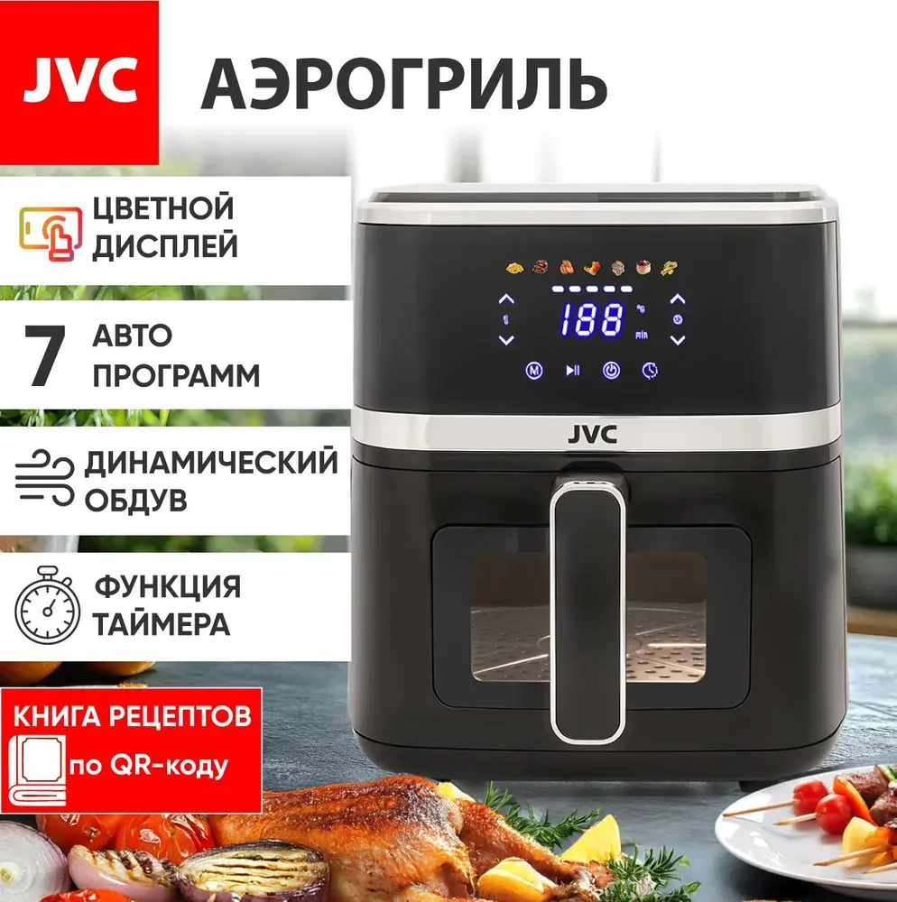 Аэрогриль JVC JK-MB043 готовит не только сытные куриные ножки и стеки, он способен создавать великолепные десерты из фруктов и даже печенье.