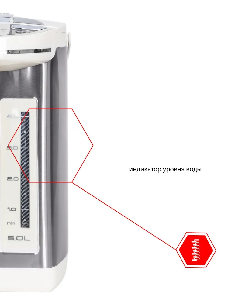 - Индикация режимов: кипячение/поддержание температуры/ожидания